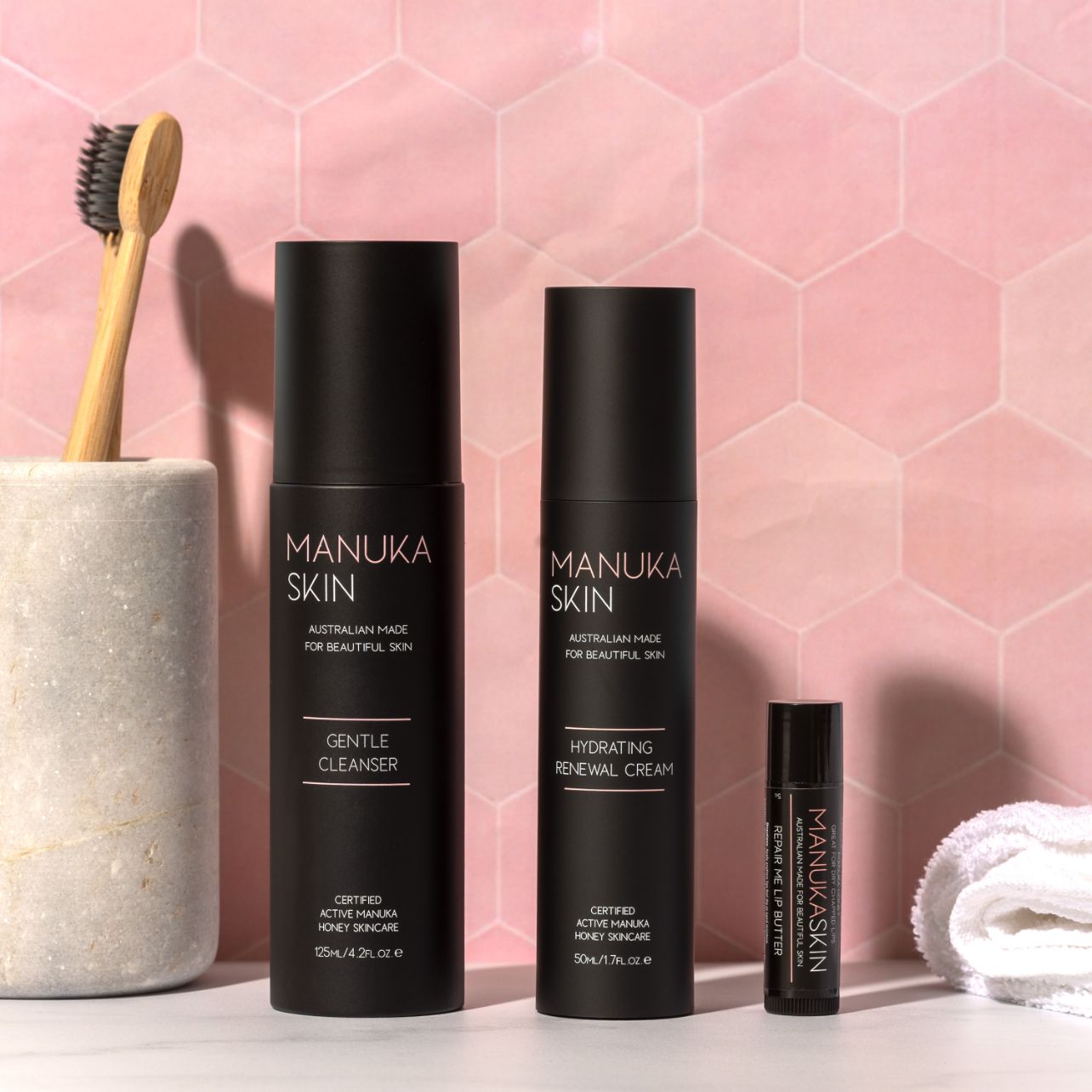 - Hydrating Renewal Cream (50ml) – Deeply hydrates with 14% Manuka honey, visibly reduces redness, and restores skin overnight or post-sun.